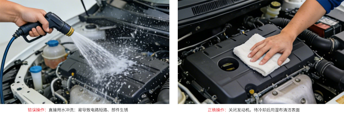 還有一個容易被忽視的誤區(qū):熱車時直接用水沖洗。發(fā)動機(jī)運轉(zhuǎn)后會處于高溫狀態(tài),缸體、缸蓋等金屬部件溫度可達(dá)幾百攝氏度,此時突然用冷水沖洗,巨大的溫差會導(dǎo)致金屬部件熱脹冷縮,極易出現(xiàn)裂紋、變形,就像滾燙的玻璃突然遇冷會炸裂一樣。此外,高溫狀態(tài)下的橡膠部件,比如水管、密封圈,遇冷水會加速老化、變硬、開裂,縮短使用壽命。